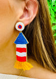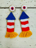 Beaded red, white, and blue rocket earrings that are the perfect accessory for any 4th of July, Memorial Day, or American festivity.
