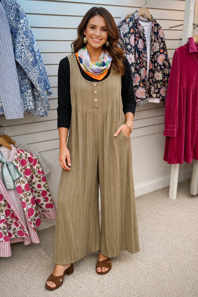 The Olive Grove Jumpsuit is the definition of effortless style and comfort. Featuring a soft, textured fabric in a beautiful olive tone, this wide-leg silhouette drapes beautifully for a flattering, flowy fit. The button-front detail and roomy pockets add both charm and function, while the sleeveless cut makes it perfect for layering over your favorite long sleeve or tee. Dress it up with wedges or keep it casual with sandals for an easy, everyday look you’ll reach for again and again.