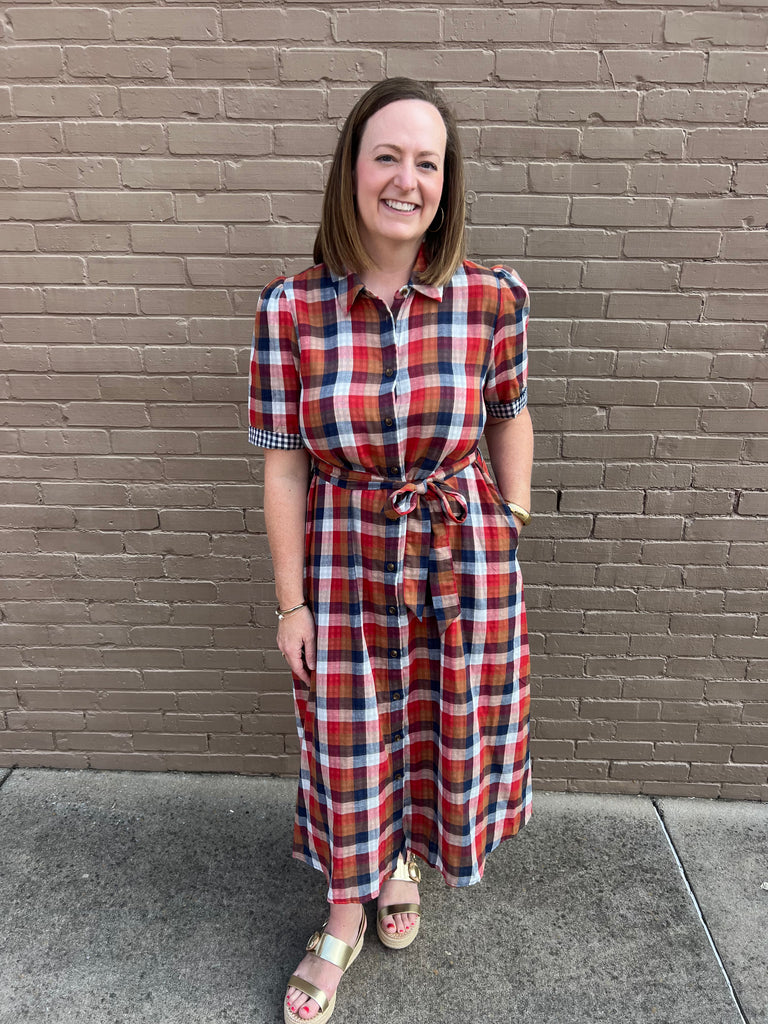 This plaid checked beauty features a collared neck, full button down closure, and a belted waistline for a flattering fit. This dress is the perfect mix of style, functionality, and comfort with it’s side pockets and short puff sleeves with gingham accents. Perfect dress for fall!