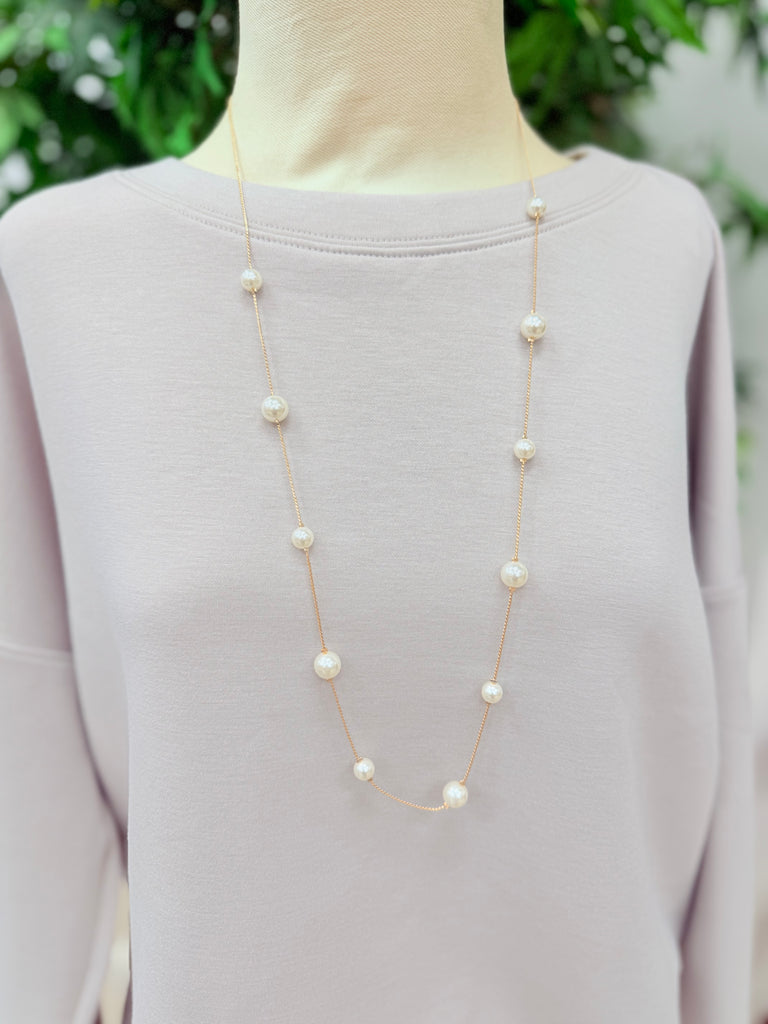 This long gold necklace with pearl detail is perfect to dress any outfit up!