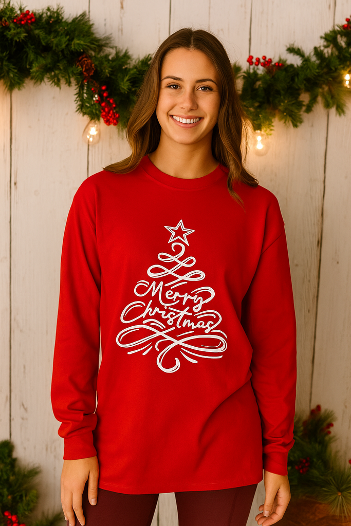 Spread holiday cheer in style with our Merry Script Tree Long Sleeve Graphic Tee! This festive red, long sleeve T-shirt features a beautifully designed white “Merry Christmas” script shape like a Christmas tree, topped with a star for that perfect seasonal touch. Crafted from soft, breathable cotton with the relaxed fit, it’s ideal for cozy nights by the fire, casual holiday gatherings, or your favorite Christmas movie marathon. Pair it with jeans or leggings for an effortlessly festive look!