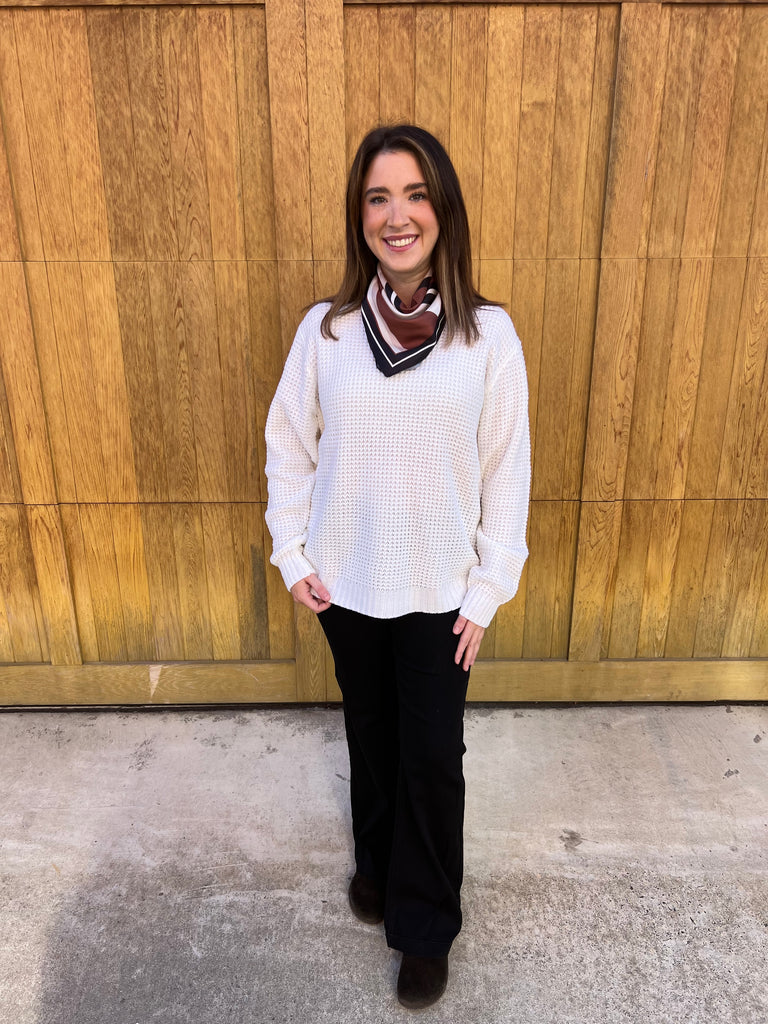 Wrap yourself in effortless comfort with this soft, waffle knit sweater – your new go to for every day style. Designed with a relaxed fit, dropped shoulders, and a gently ribbed him and cuffs, it drapes beautifully for a laid-back yet polished look. It’s breathable textured knit makes it perfect for layering, while still offering that warm, cozy fell you love. Available in classic white or sleek black, it’s the perfect closet staple for any season.