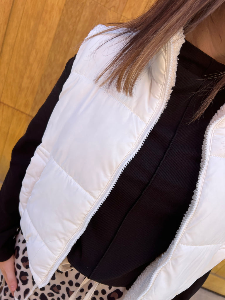 Double the style, double the comfort! This reversible vest gives you two totally different looks in one must have piece. One side features a sleek, smooth puffer finish for a clean, polished vibe, while the other flips to a soft plush Sherpa for the ultimate cozy feel. Designed with a light weight, easy to layer – fit, it adds warmth without bulk– perfect for throwing on over your favorite basics. Front pockets, a full zip closure, and a versatile neutral tone makes it in an effortless staple for every outfit.