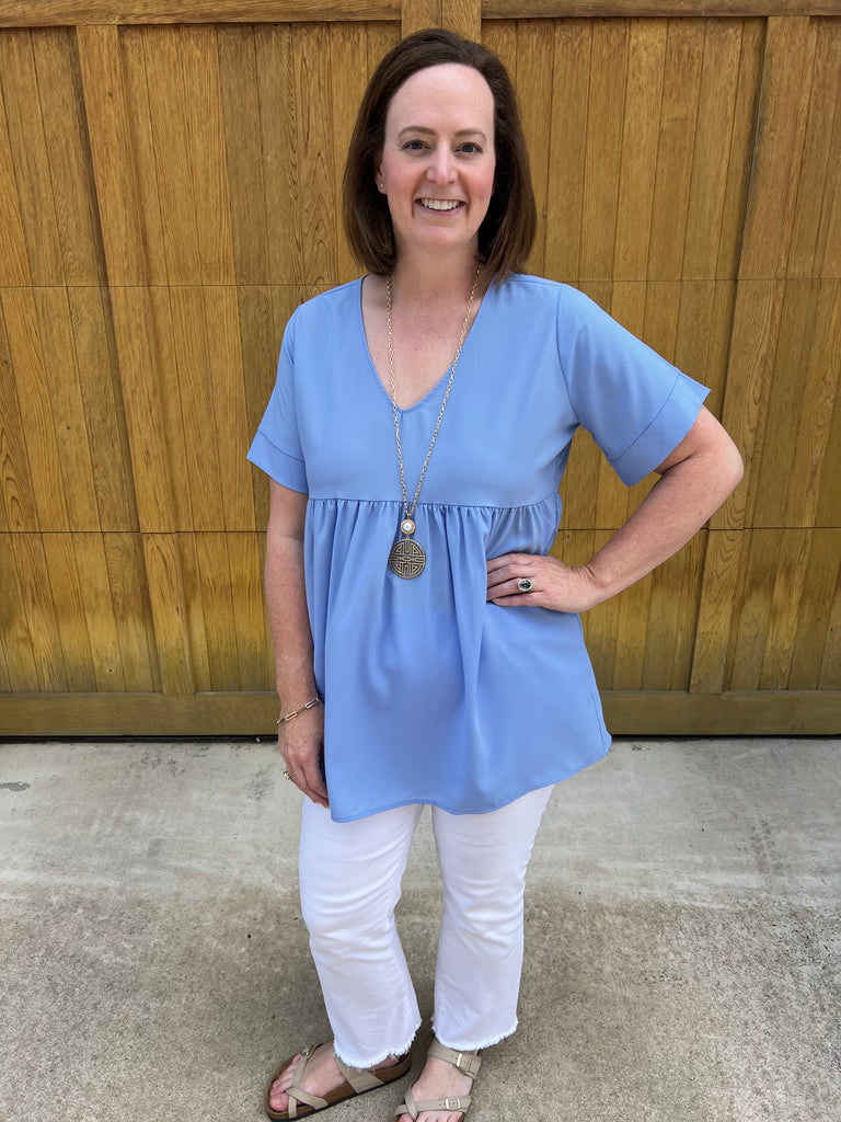 This relaxed babydoll top is so cute! Perfect color for spring and summer! Pair with a white denim and wedge for the cutest outfit!